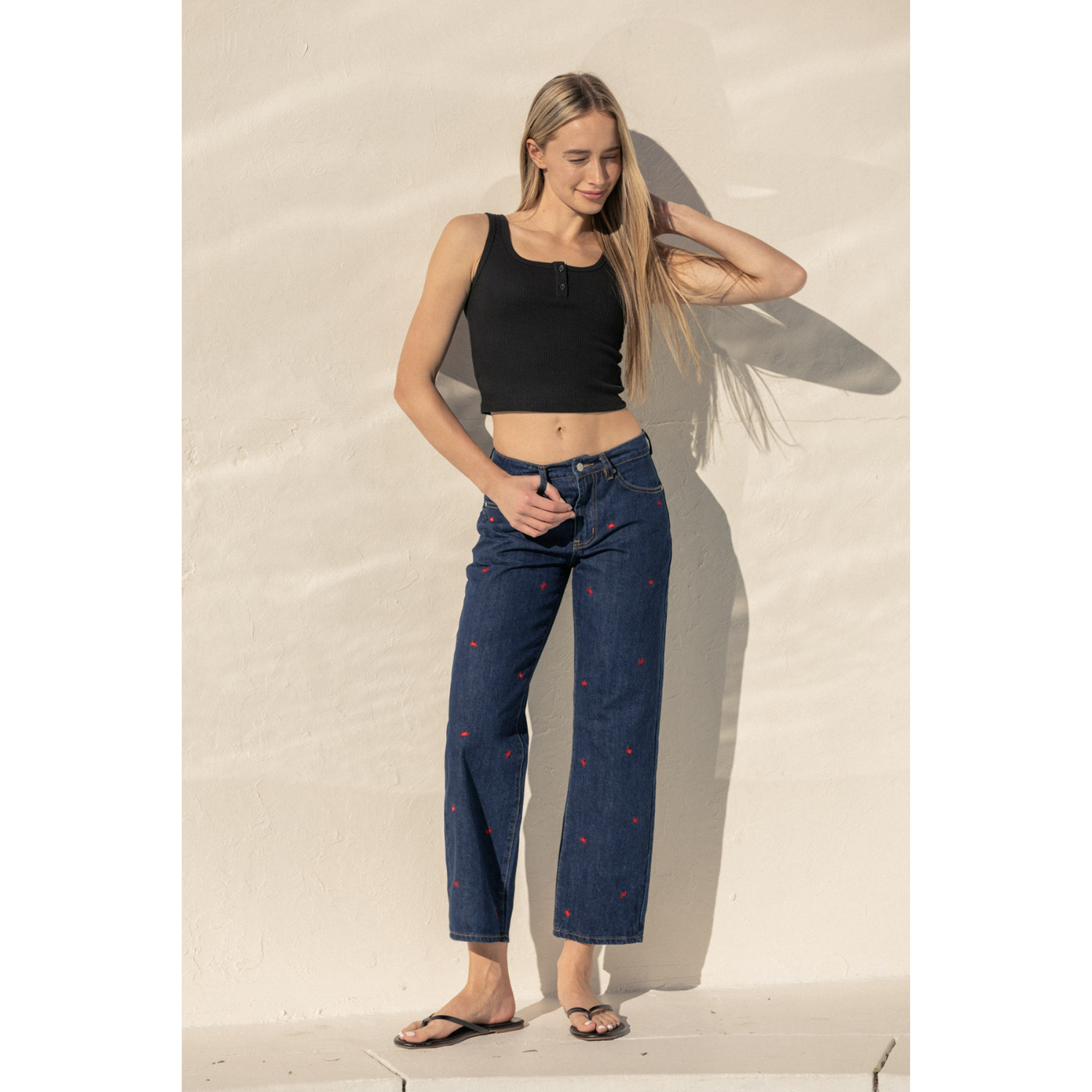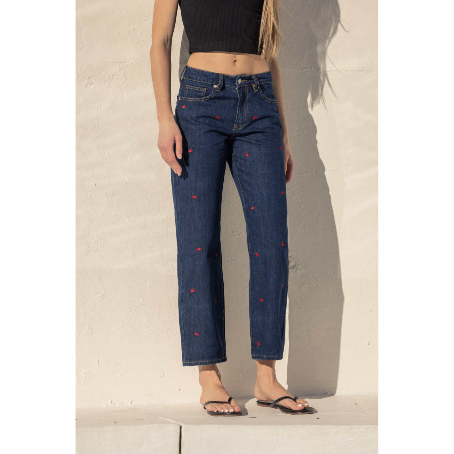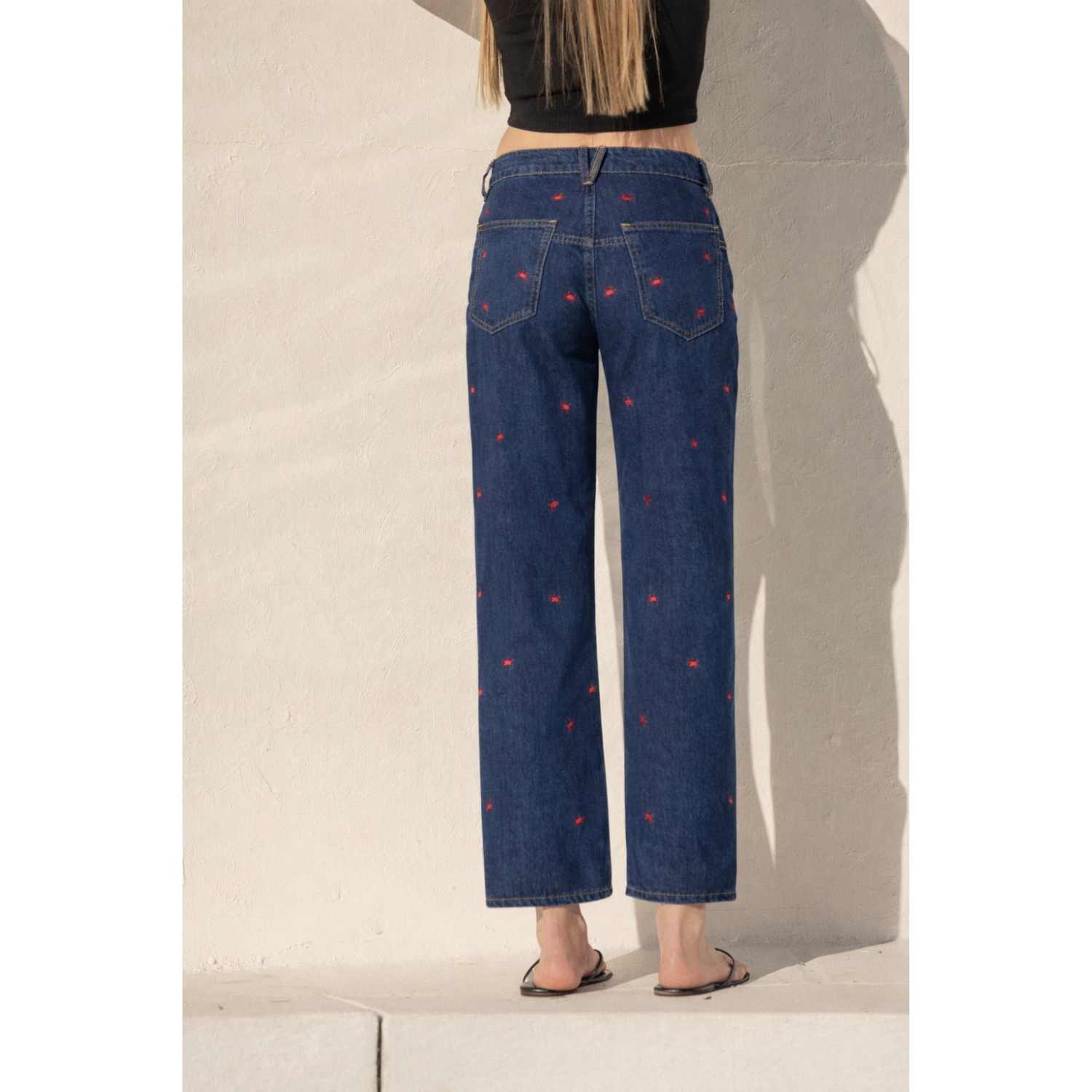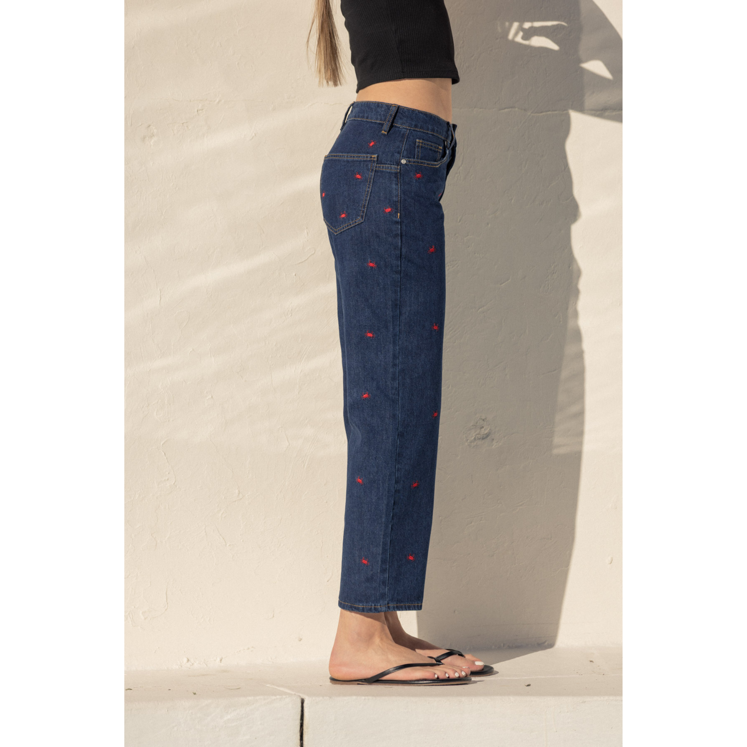All Over Crab Embroidered Ankle Length Baggy Jeans - Dark Wash