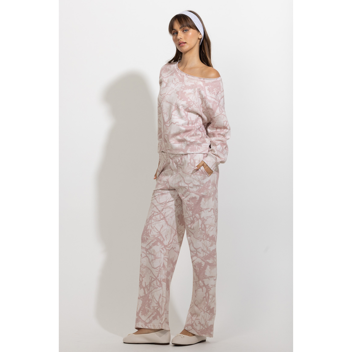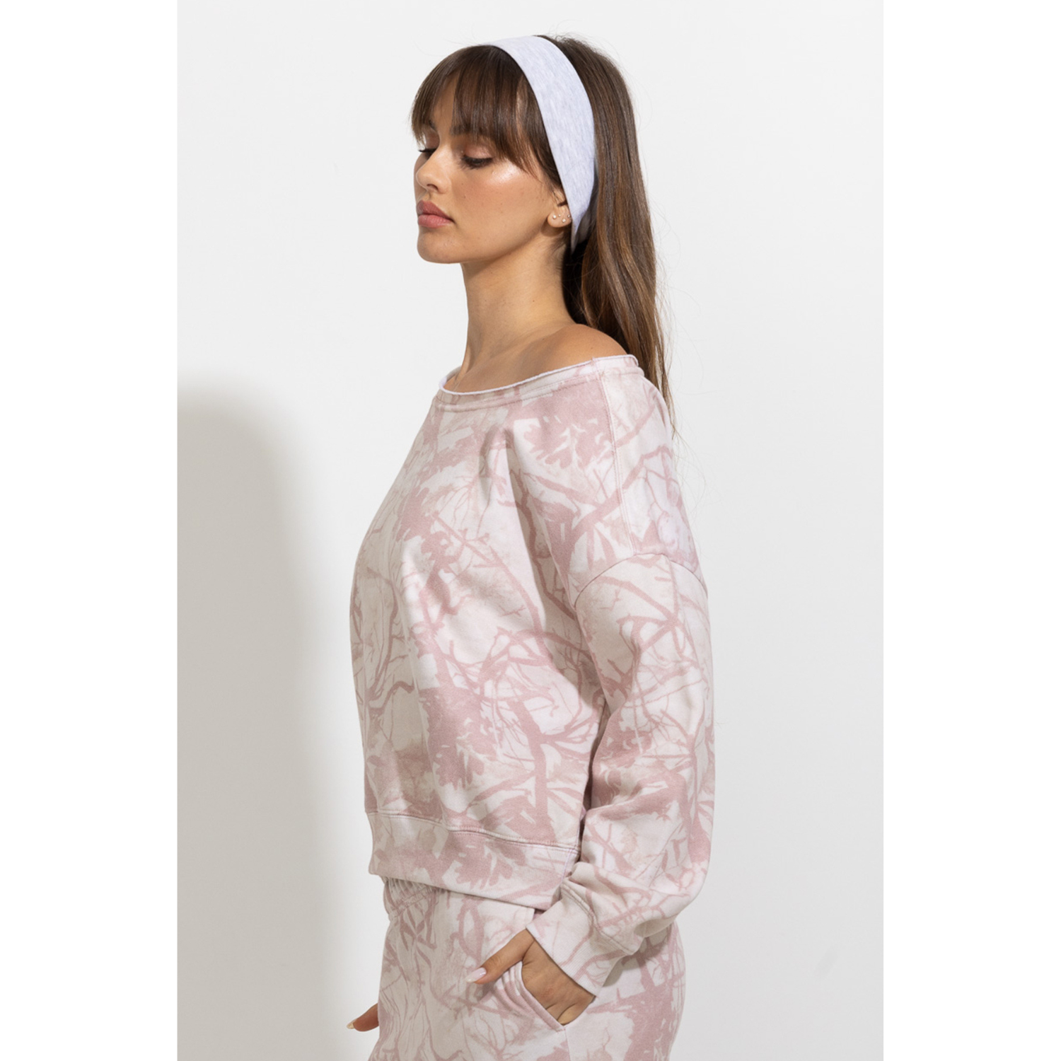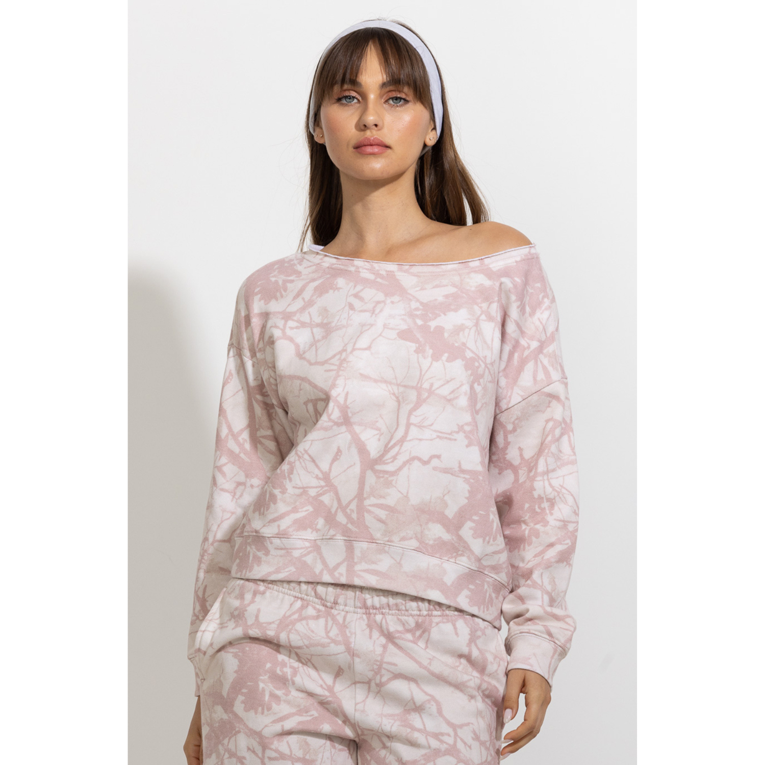 This off-shoulder sweatshirt blends relaxed comfort with a soft, feminine feel. Designed with a loose silhouette and wide neckline, it drapes effortlessly for an easy, laid-back look. The tree-camo inspired print gives it a subtle outdoorsy edge while the soft color palette keeps the overall mood feminine and delicate. Easy to pair with matching lounge bottoms or casual everyday pieces, it’s a cozy style that feels both comfortable and effortlessly styled.