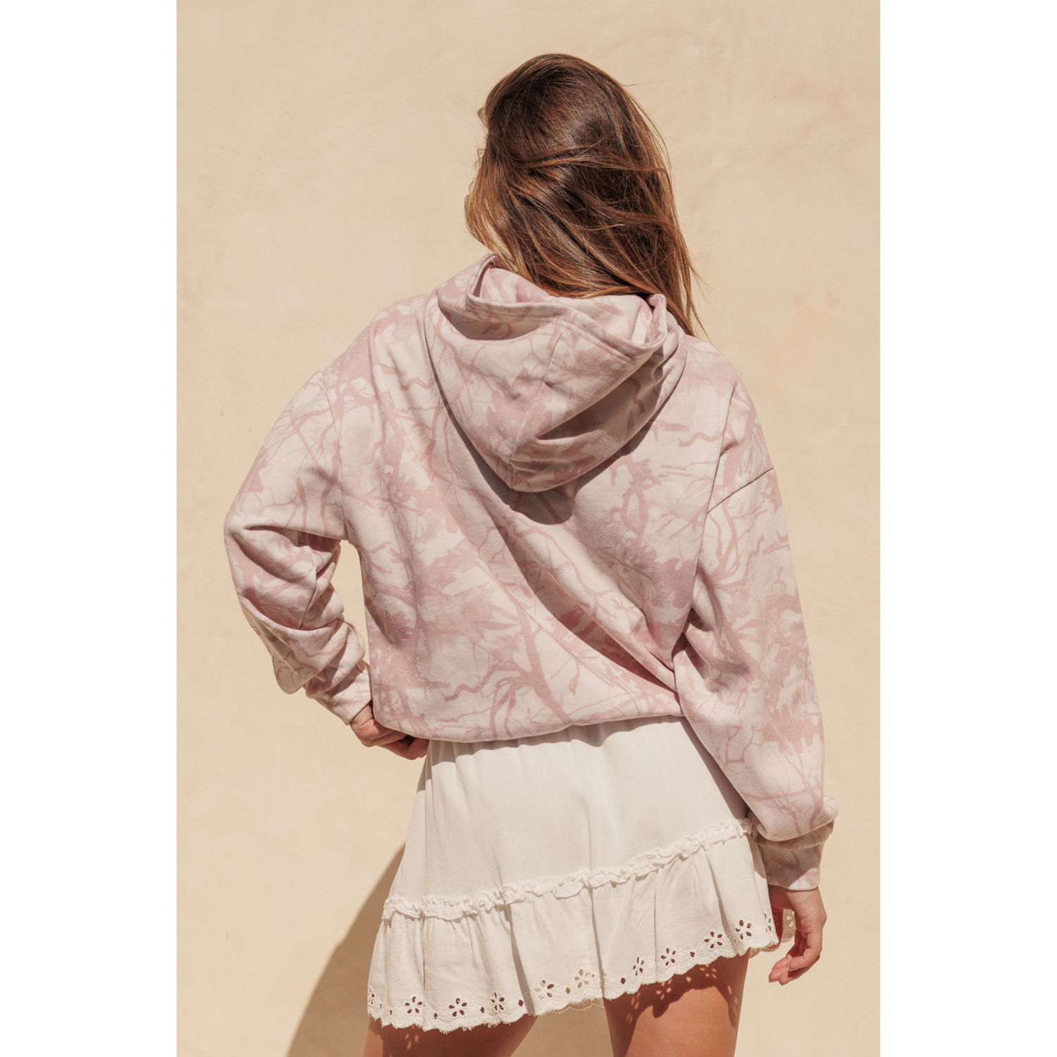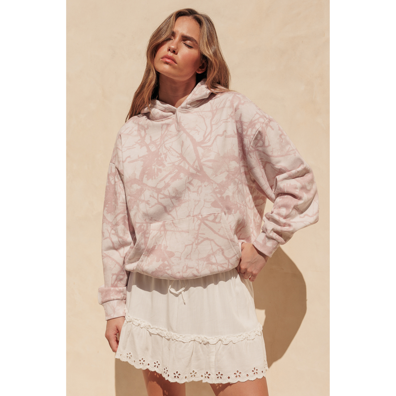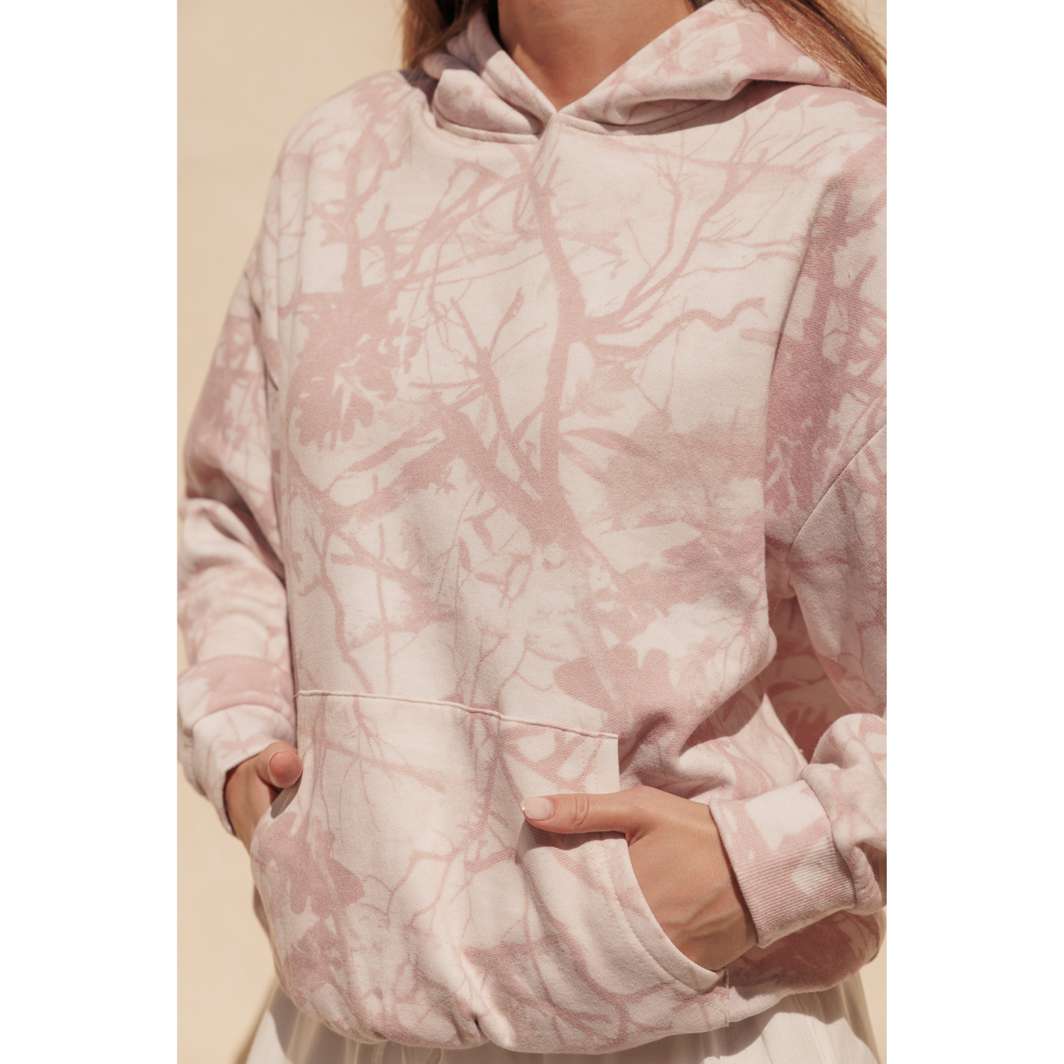 This tree camo-print hoodie blends comfort with a soft, feminine touch. Designed with a relaxed fit and subtle all-over pattern, it offers a cozy feel while adding visual interest to your everyday look. Finished with a classic hood and front kangaroo pocket, it’s an easy layering piece that feels effortless yet put together.