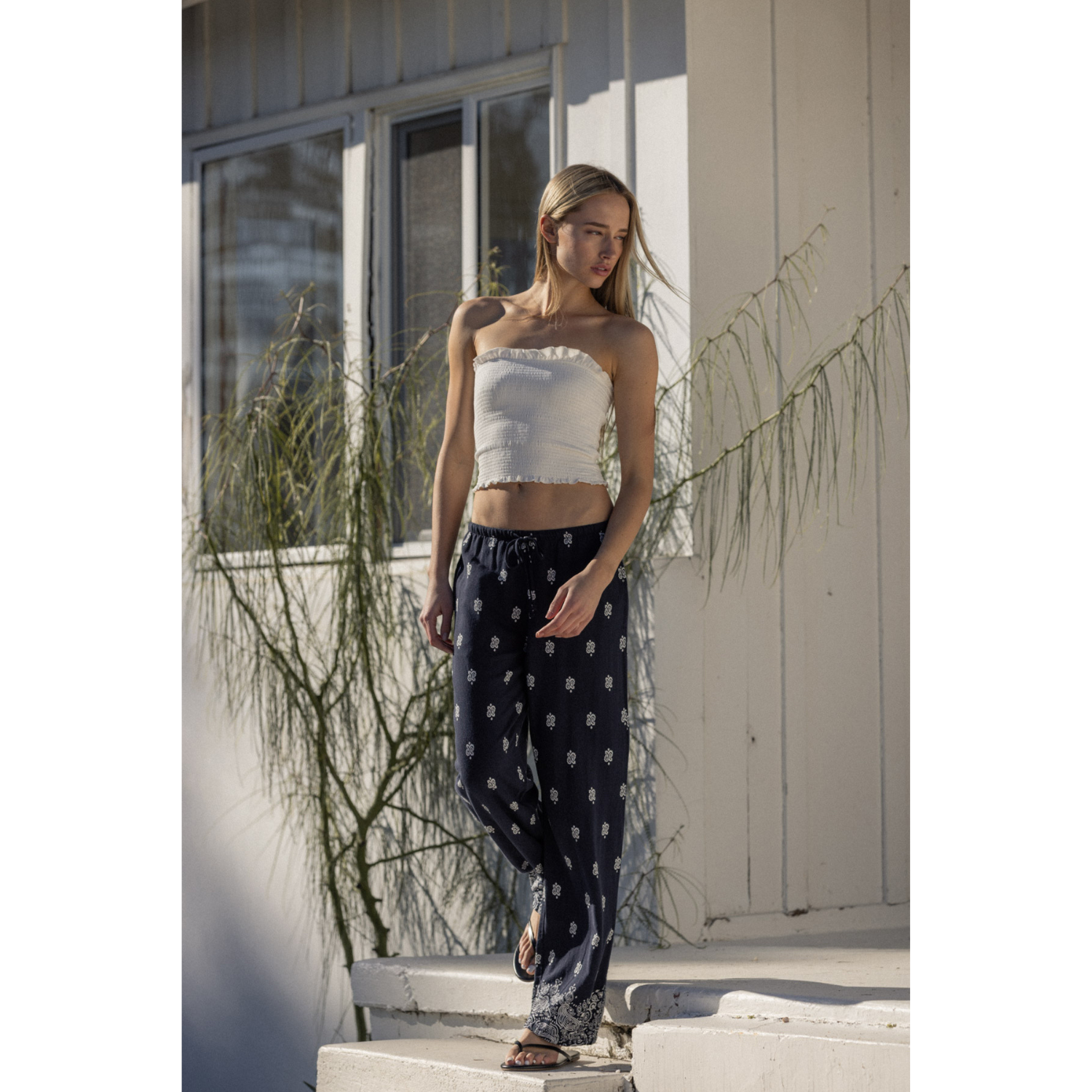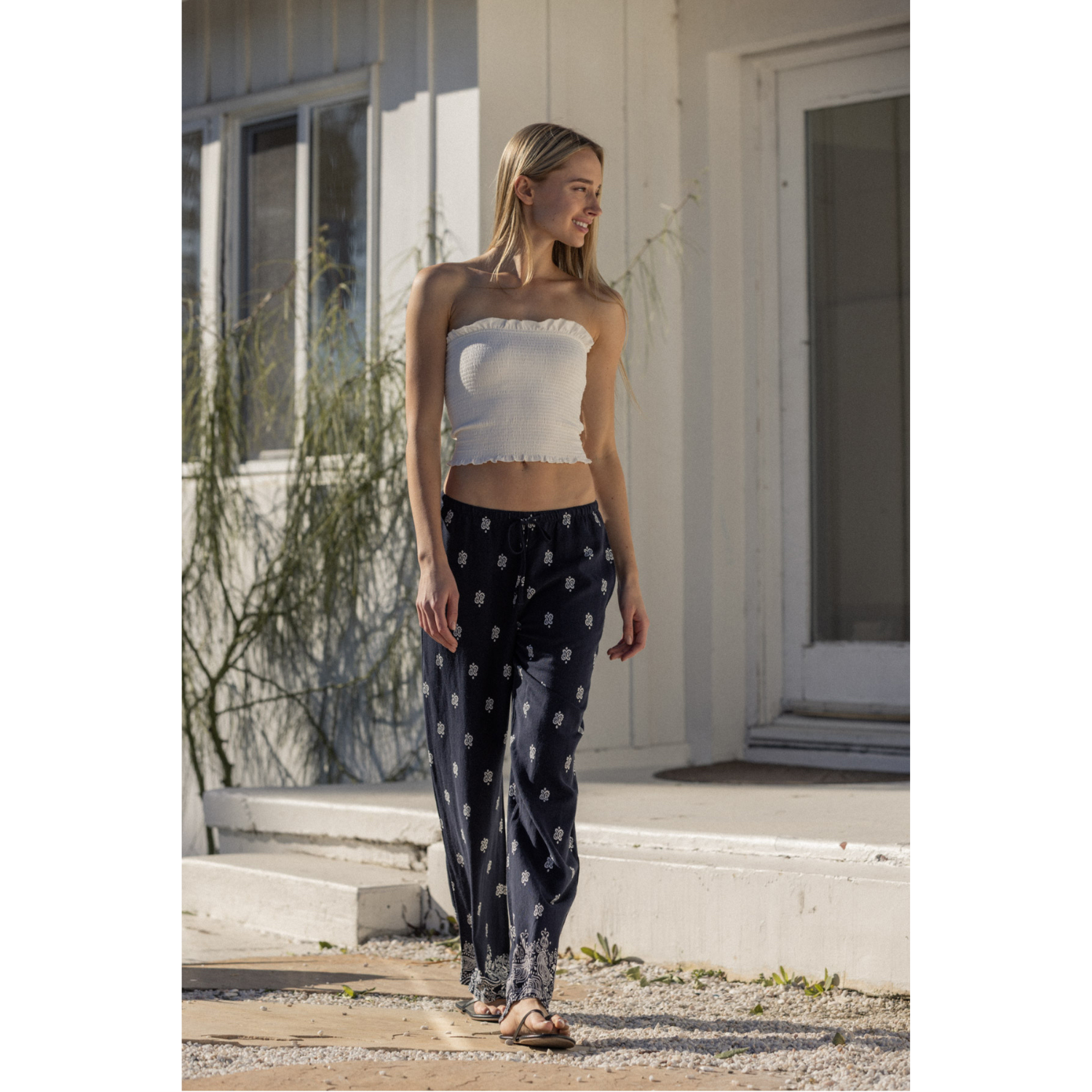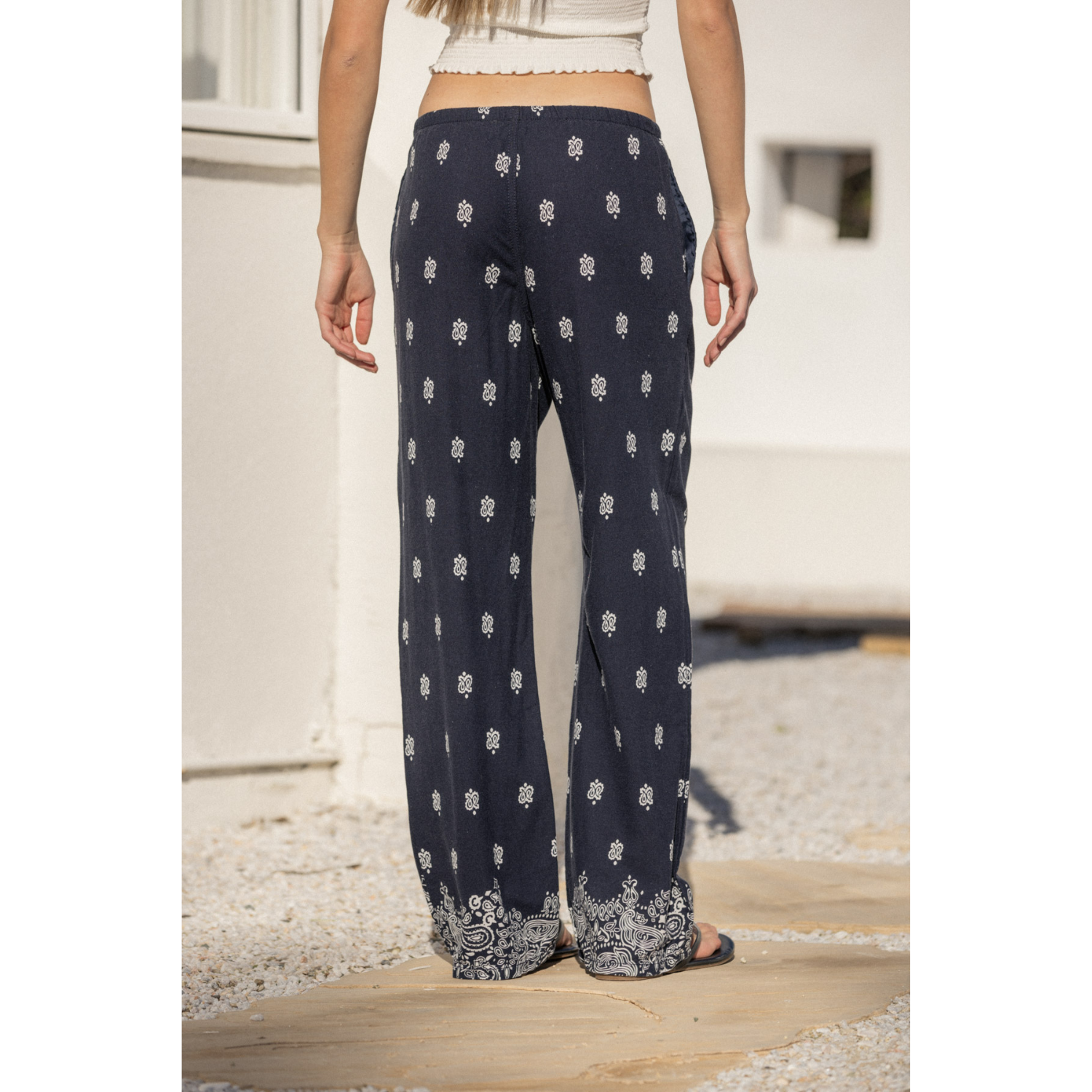 The relaxed straight-leg silhouette creates a clean, elongated line, while the elastic waistband with an adjustable drawstring ensures a flexible, comfortable fit. An all-over paisley-inspired print with a subtle border detail at the hem adds a distinctive, vintage-inspired character. Functional side seam pockets provide everyday practicality.