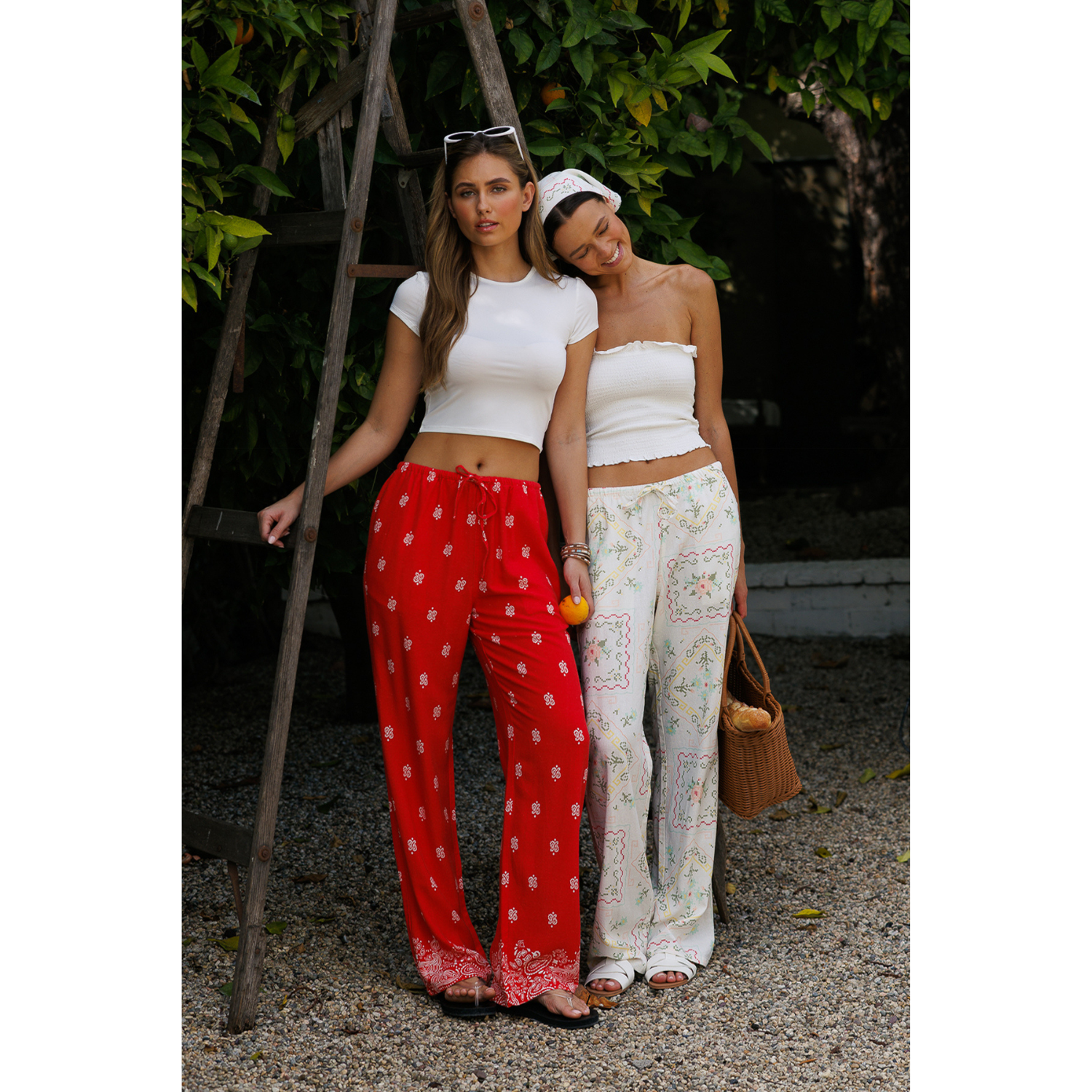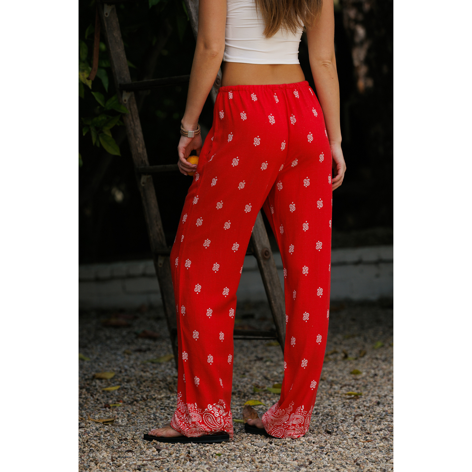 Border Printed Linen Pull-on Pants - Red