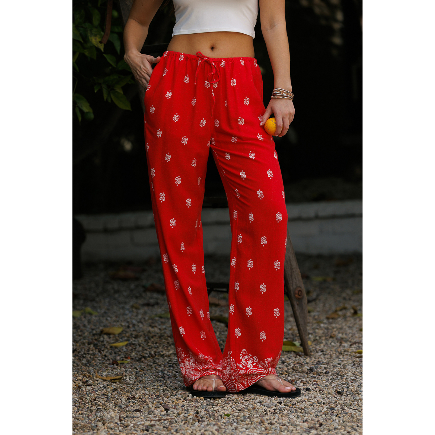 The relaxed straight-leg silhouette creates a clean, elongated line, while the elastic waistband with an adjustable drawstring ensures a flexible, comfortable fit. An all-over paisley-inspired print with a subtle border detail at the hem adds a distinctive, vintage-inspired character. Functional side seam pockets provide everyday practicality.