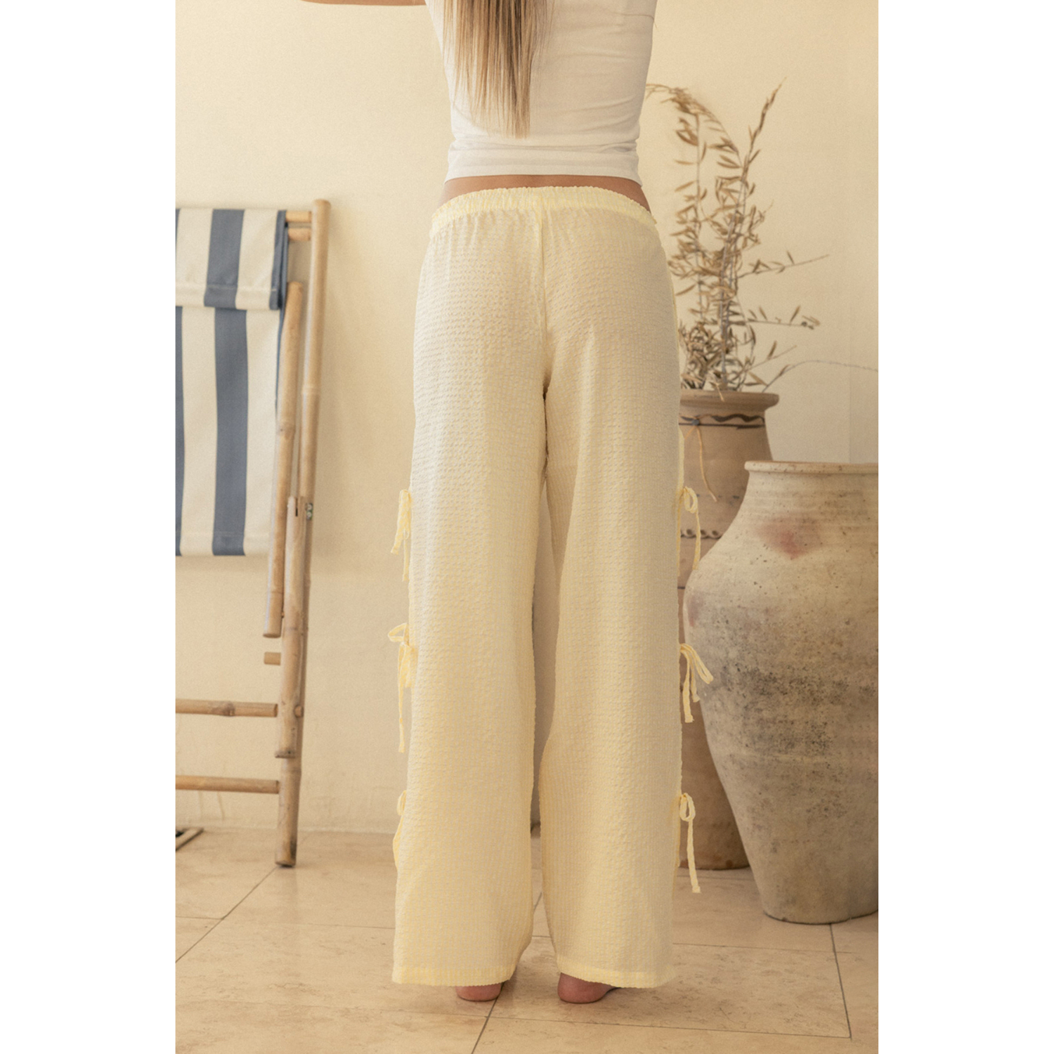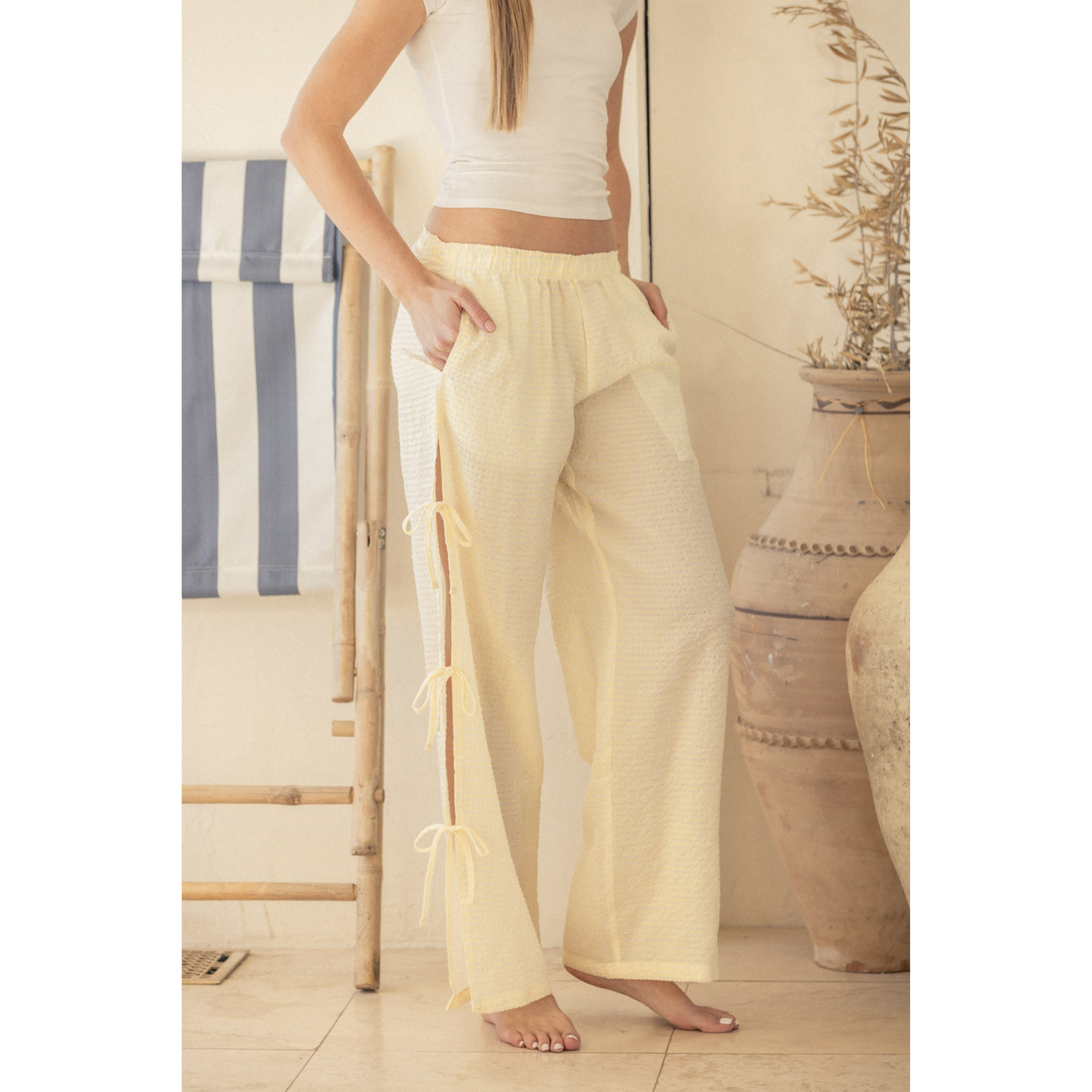 Gingham Seersucker Side Slit Pull-On Pants - Yellow Gingham