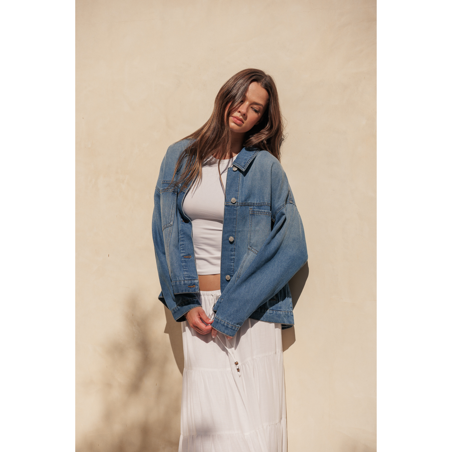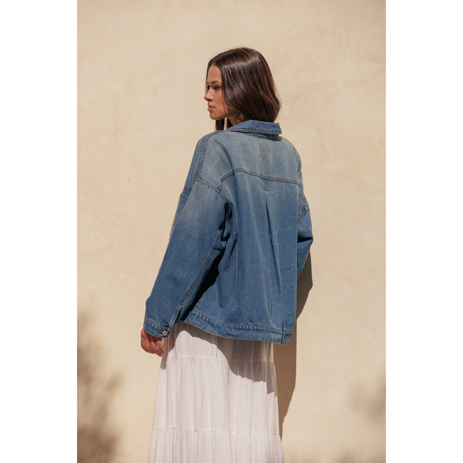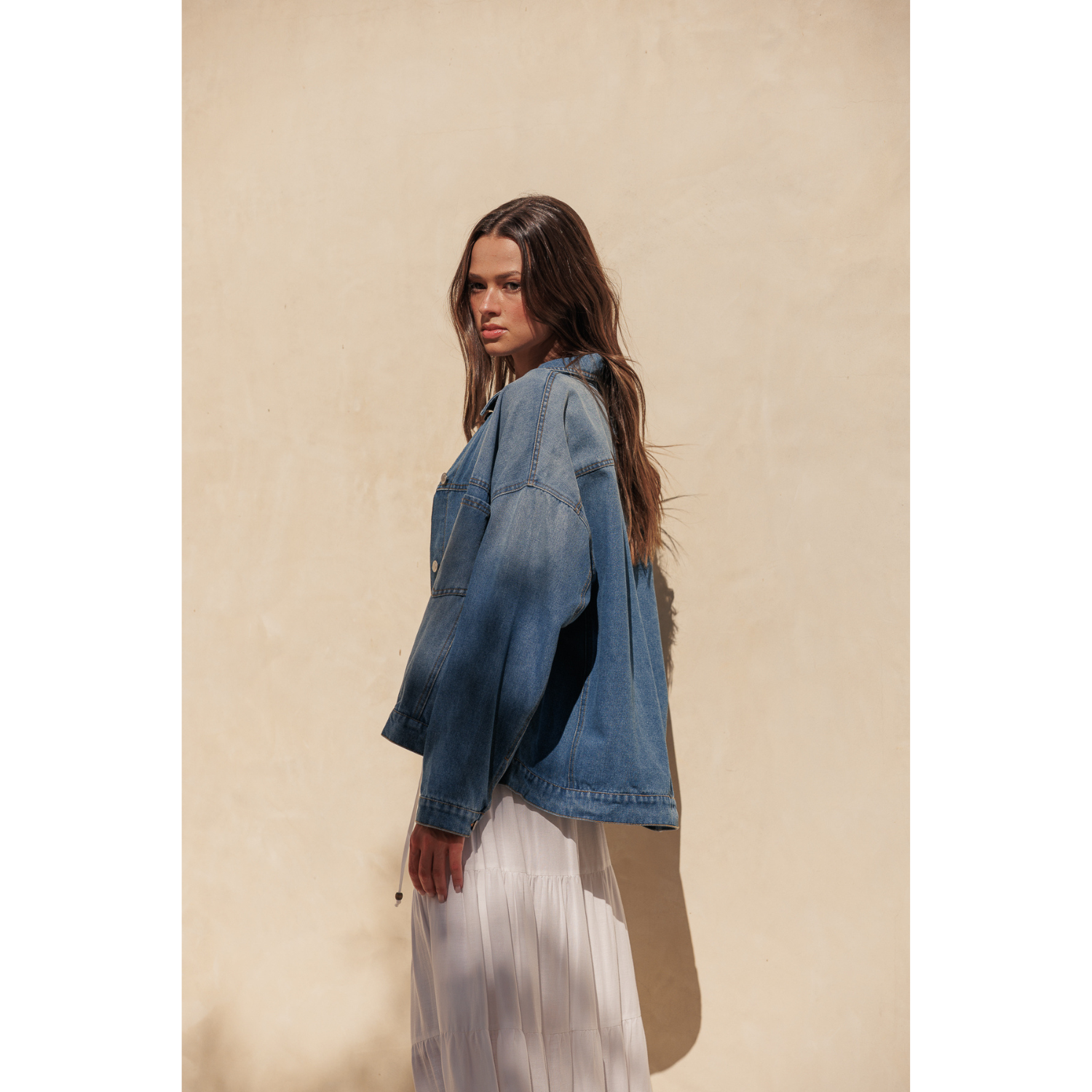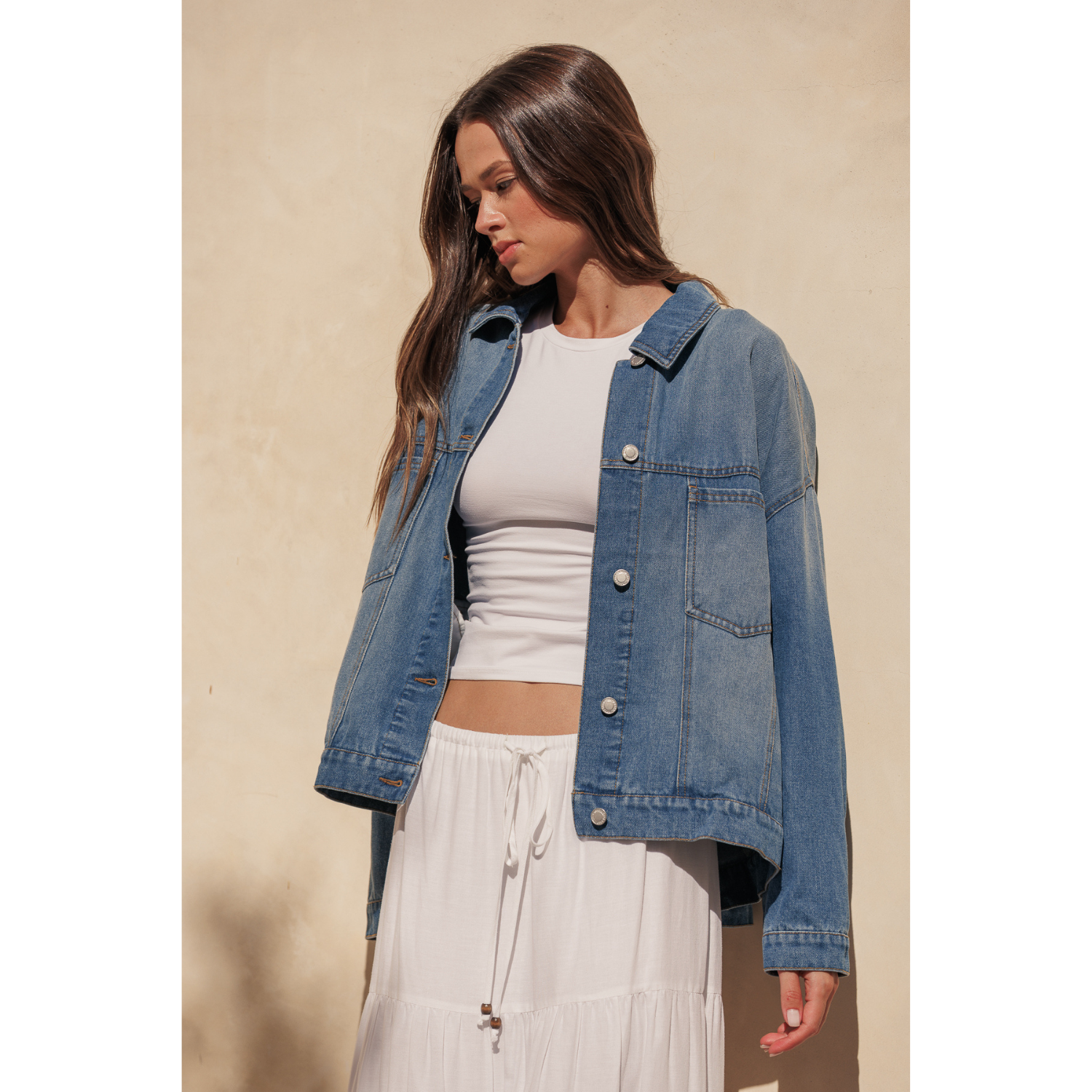 Introducing the Oversized Swing Denim Jacket, a stylish and versatile addition to your wardrobe. This medium-wash denim jacket features distinctive chest pockets, a classic front button closure, and stylish pleats at the center back, seamlessly blending comfort and fashion.