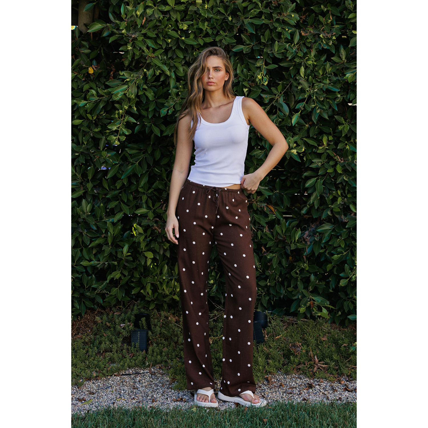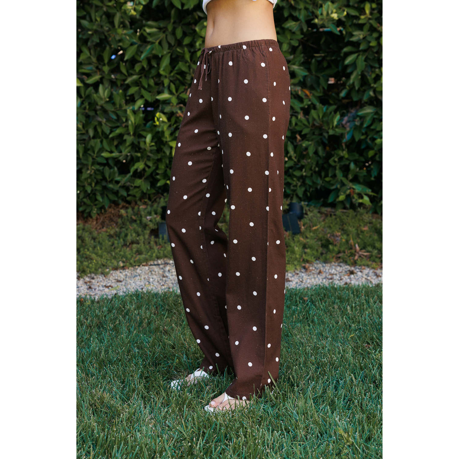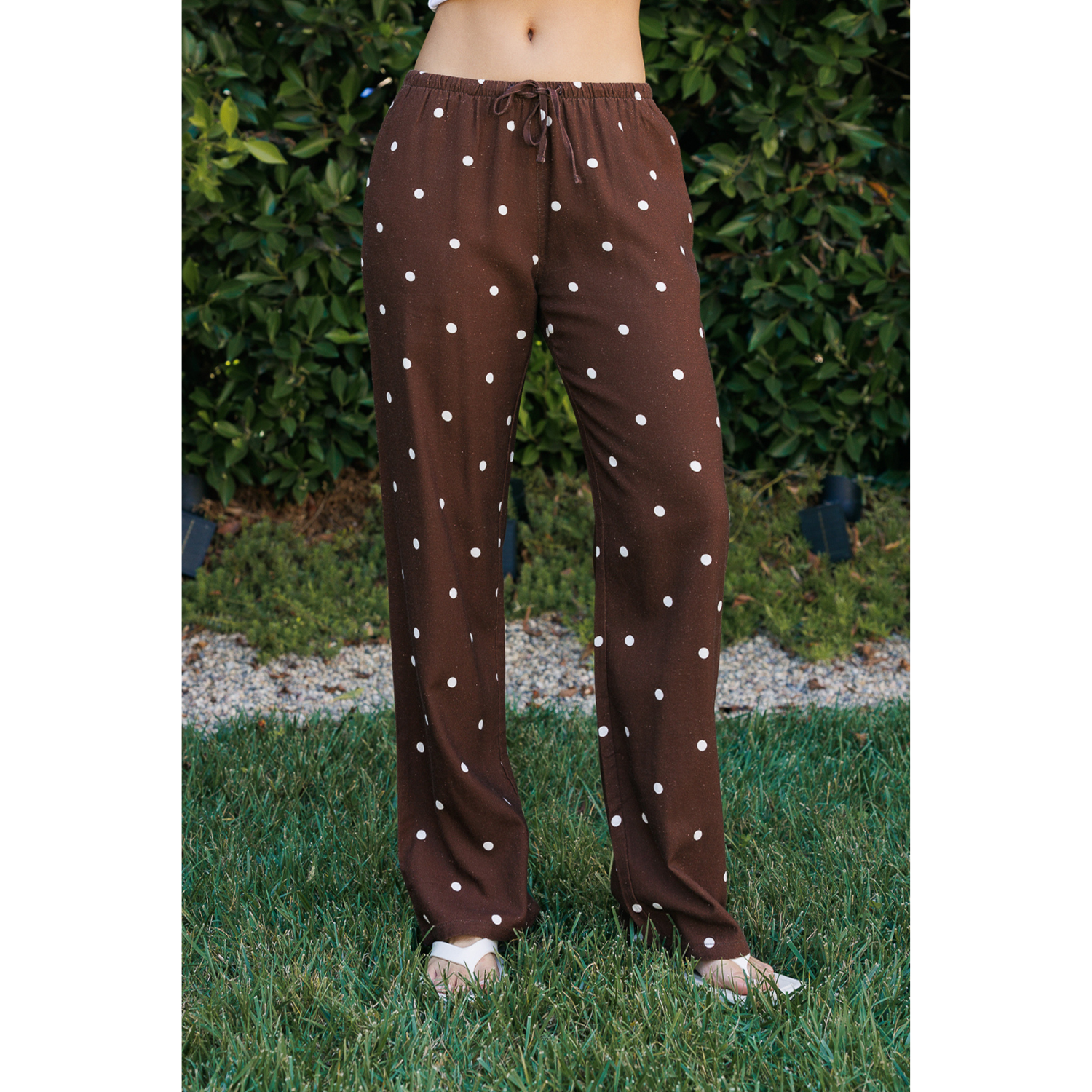 The relaxed straight-leg silhouette creates a clean, elongated line, while the elastic waistband with an adjustable drawstring provides a flexible and comfortable fit. A classic polka dot print adds a subtle vintage charm, and functional side seam pockets offer everyday practicality.