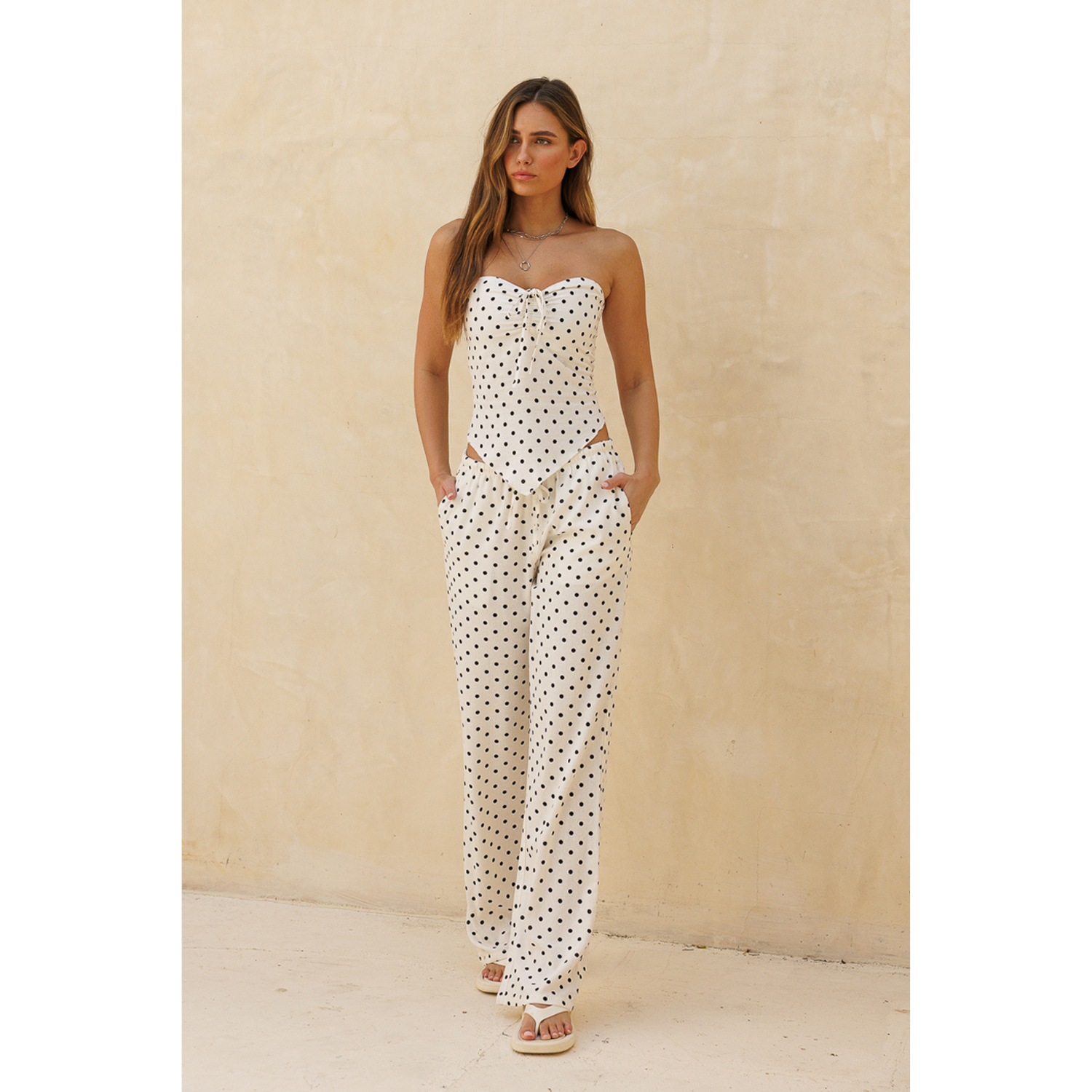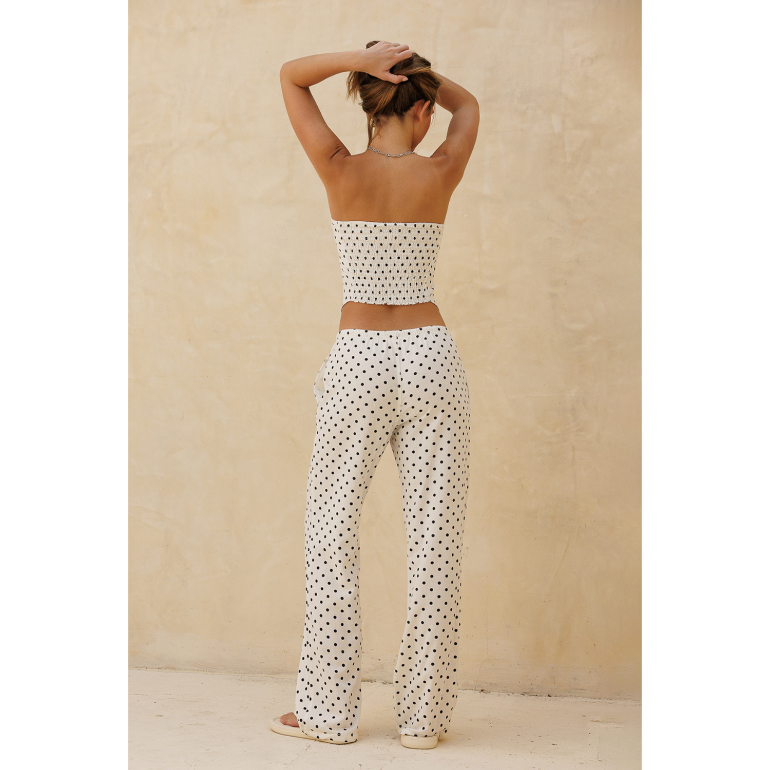 The relaxed straight-leg silhouette creates a clean, elongated look, while the elastic waistband with an adjustable drawstring provides a flexible, comfortable fit. A classic polka dot print adds a timeless touch, and functional side seam pockets bring everyday practicality.