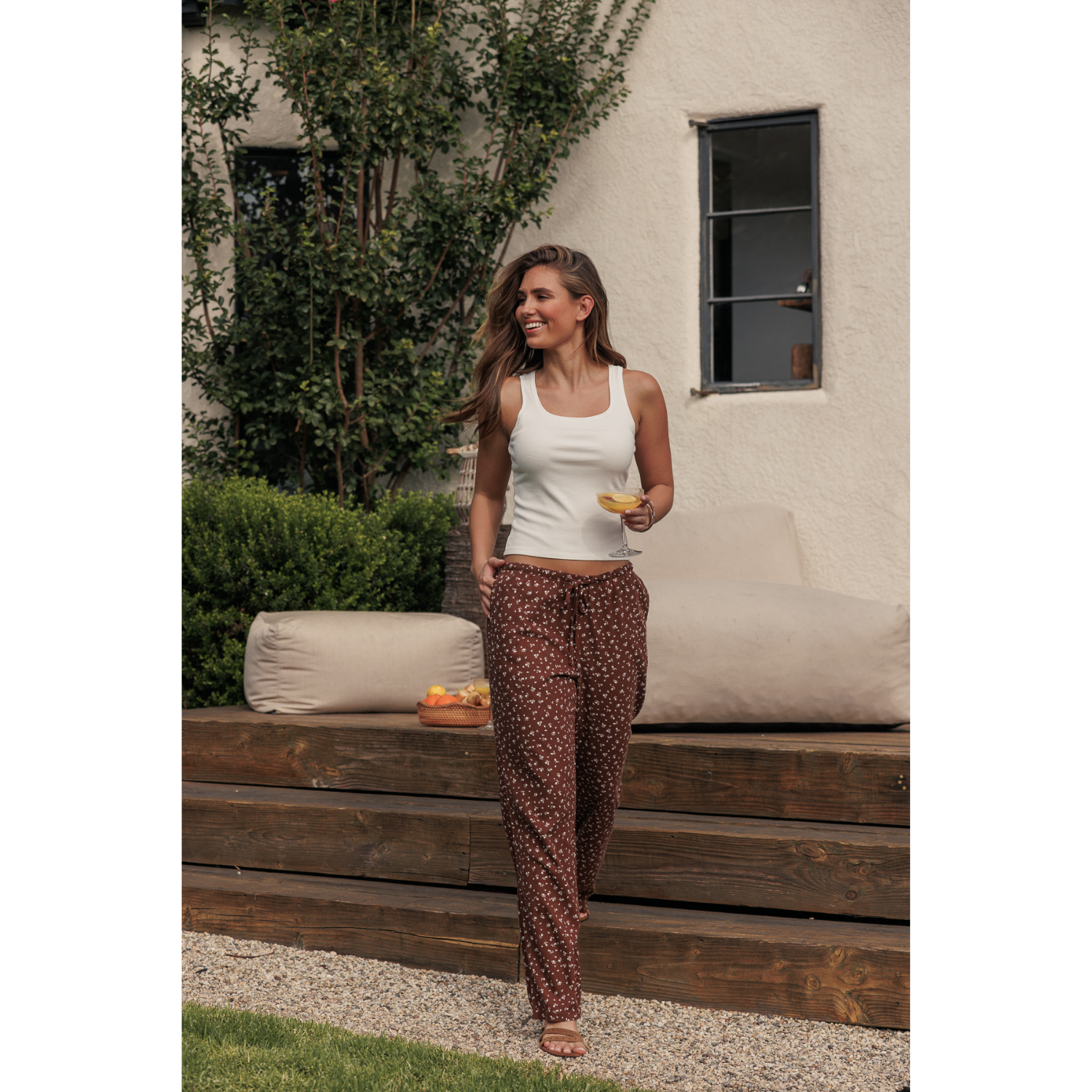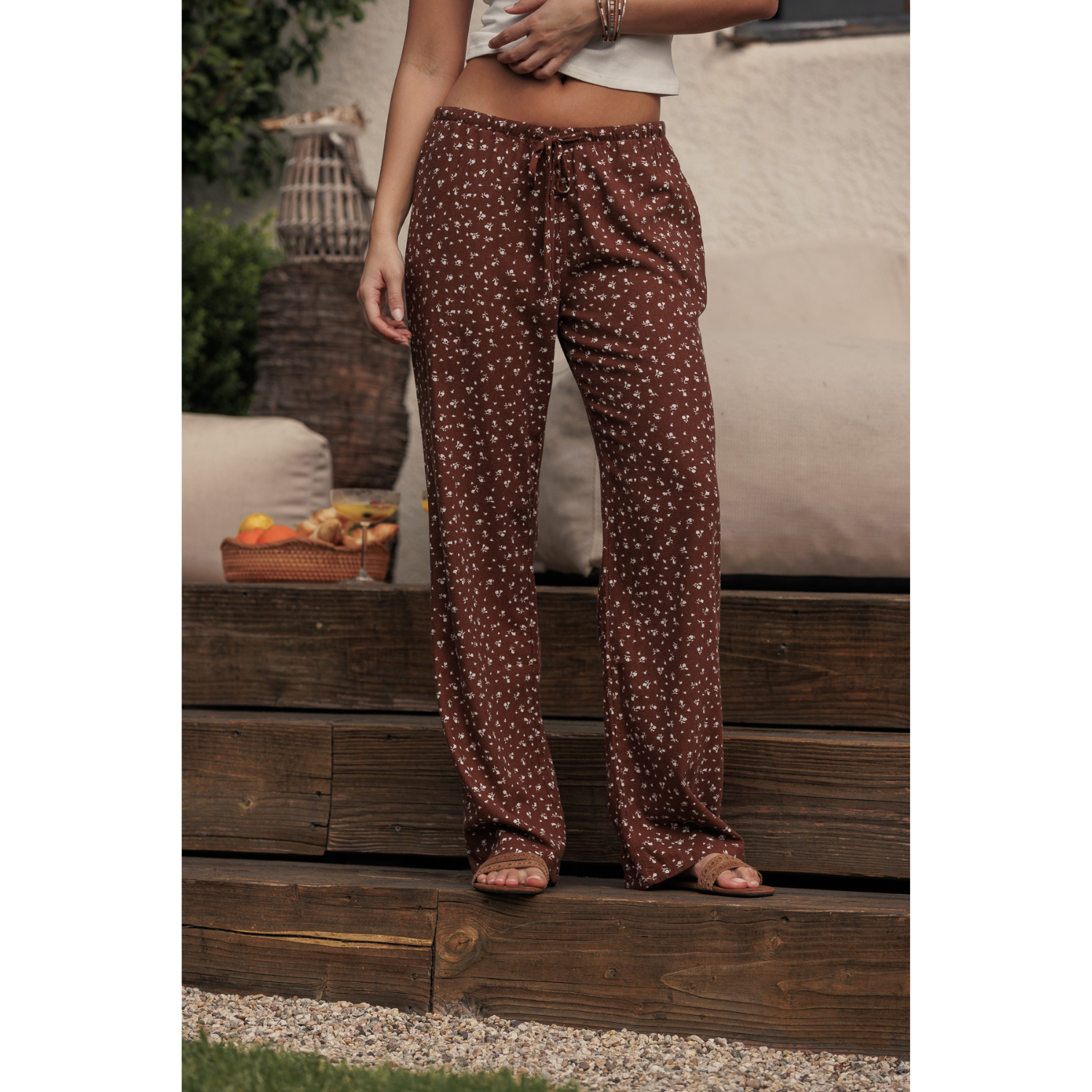 Printed Linen Pull On Pants - Brown Ditsy Floral