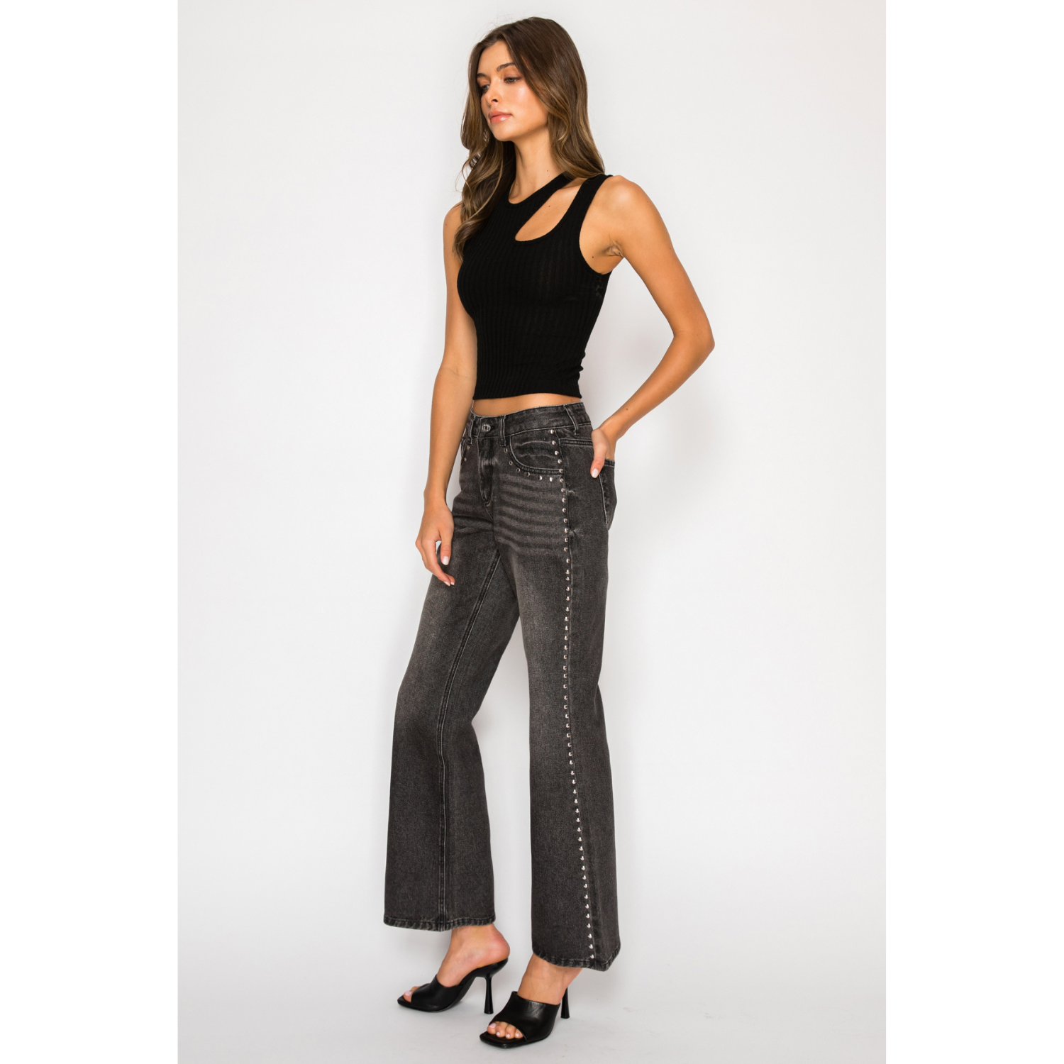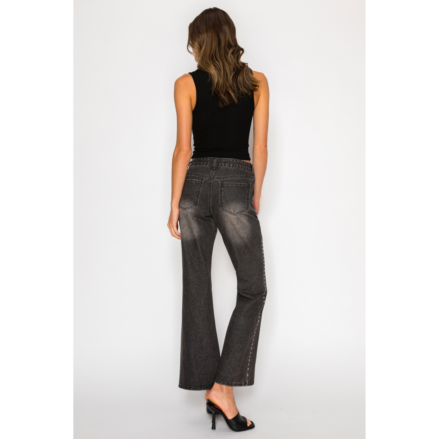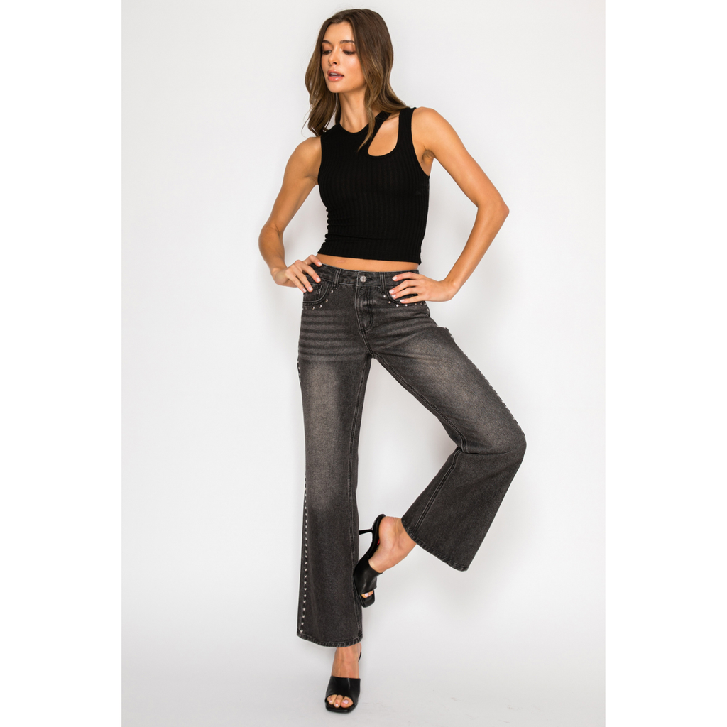 Studded Low Rise Bootcut Jeans - Washed Black