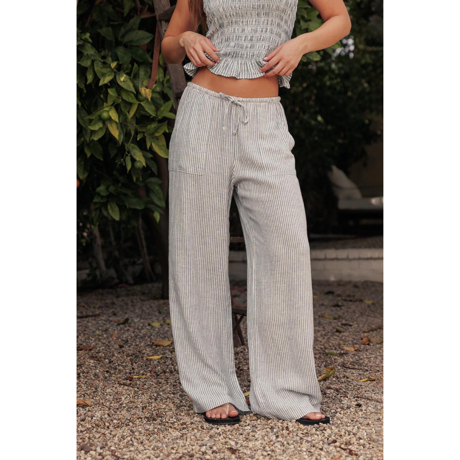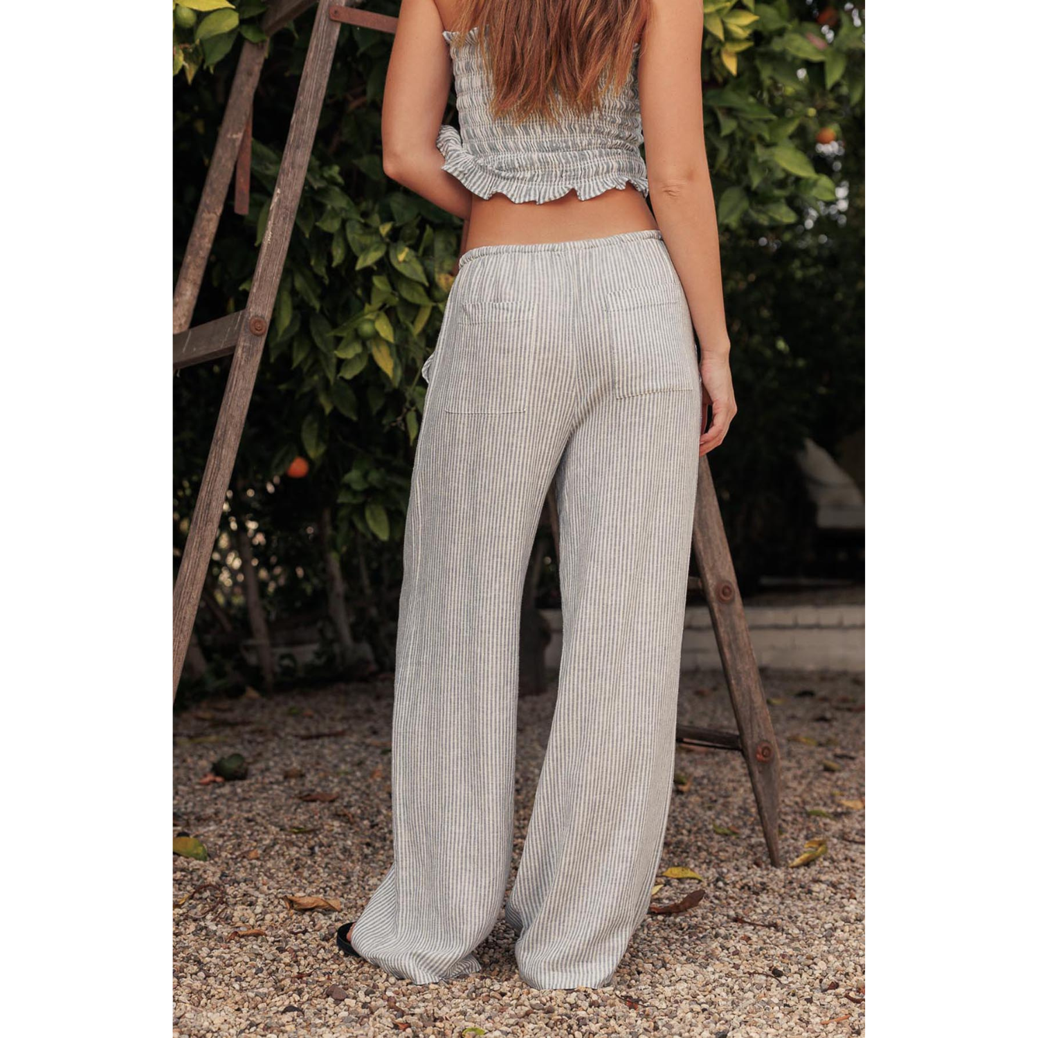 Crafted from breathable yarn-dyed linen, these striped wide-leg pants offer lightweight comfort with a relaxed, flowing silhouette. The pull-on design with an elastic drawstring waistband ensures an easy, adjustable fit, while the wide-leg shape creates effortless movement.